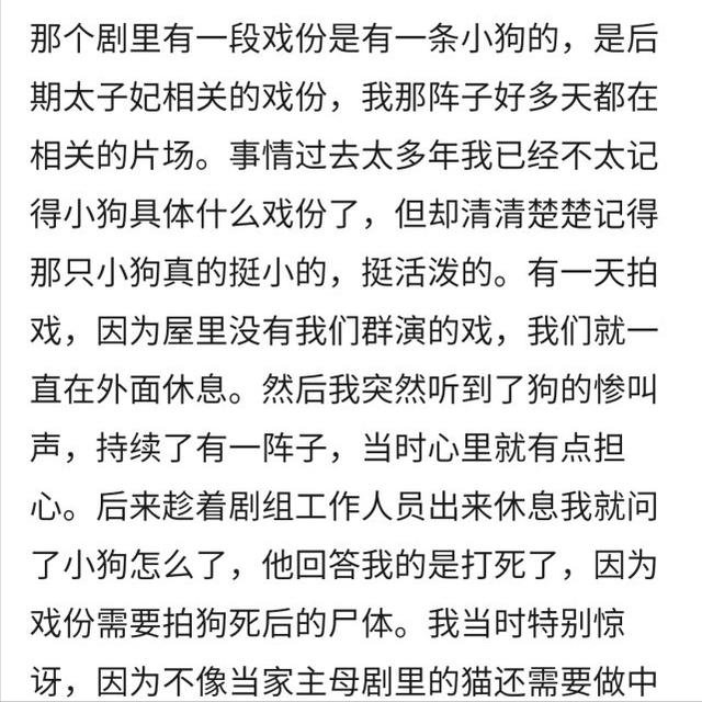 他们在后台准备,就听到狗狗的惨叫,出来一看狗狗流着血,有人在那边处理。他们很是难受,就问打一针麻药就好了,为啥要打死呢?当时的负责人说:去哪儿给它找麻药啊,一下打死就很方便啊。