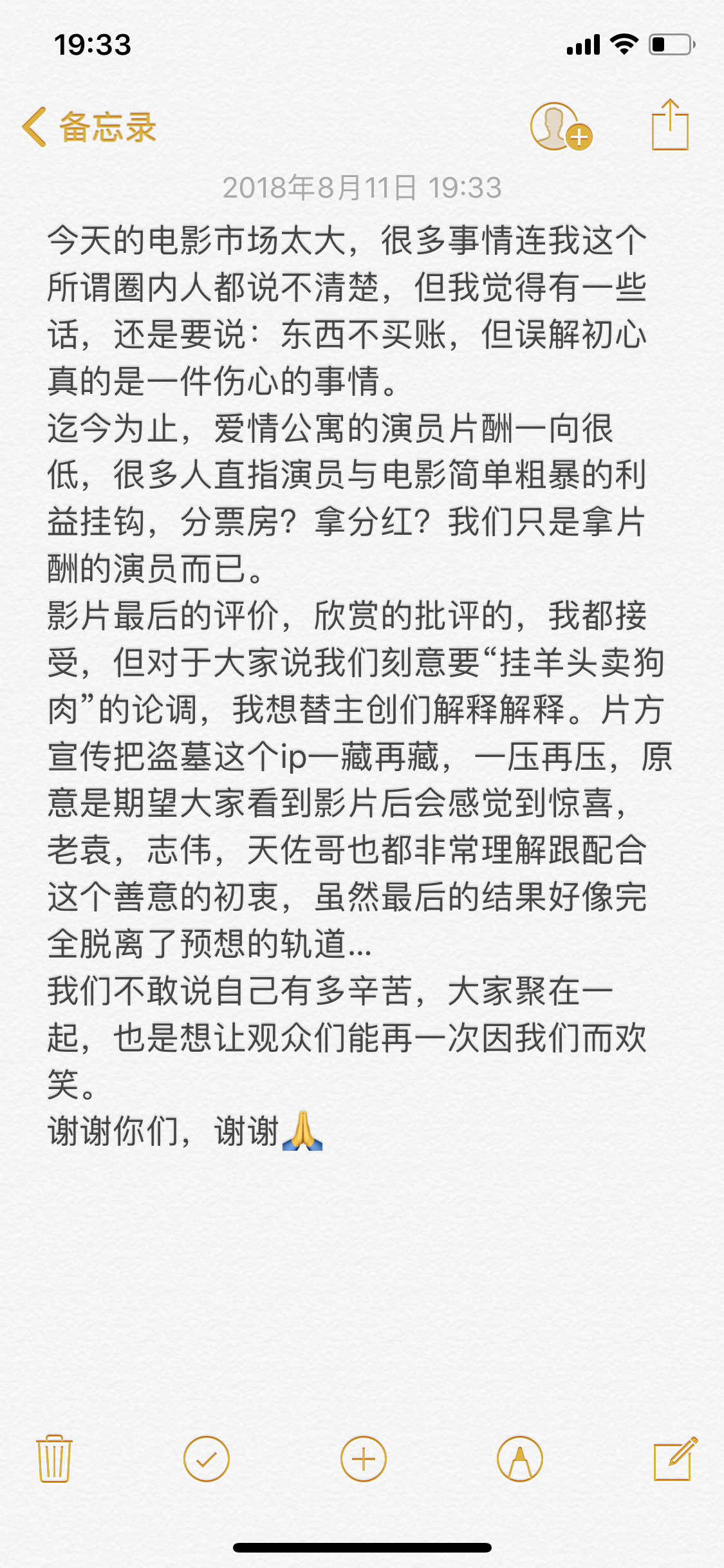 首先,李佳航就表明,爱情公寓的演员片酬一向很低,他们不会拿票房分红。