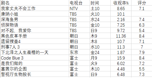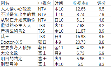 17夏季日剧收视情况 17秋季日剧收视情况前两季的情况也差不多。除了《code blue 3》有着超强的人气可以挺得住,也就《刑警弓神》意外评价不错,然而这些都不足以每集10几部新番,富士的剧几乎都是倒数的。这一季tbs的两部剧都很不错,朝日台还有木村坐镇,相比之下,富士真是没法看了。至于富士是如何一步步毁掉他们的黄金招牌月九的,那就是另一个问题了。
