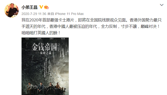 随着疫情逐渐得到控制,电影院相继复工,王晶在社交平台之上,发布了《金钱帝国2:巅峰之战》即将上映的消息。