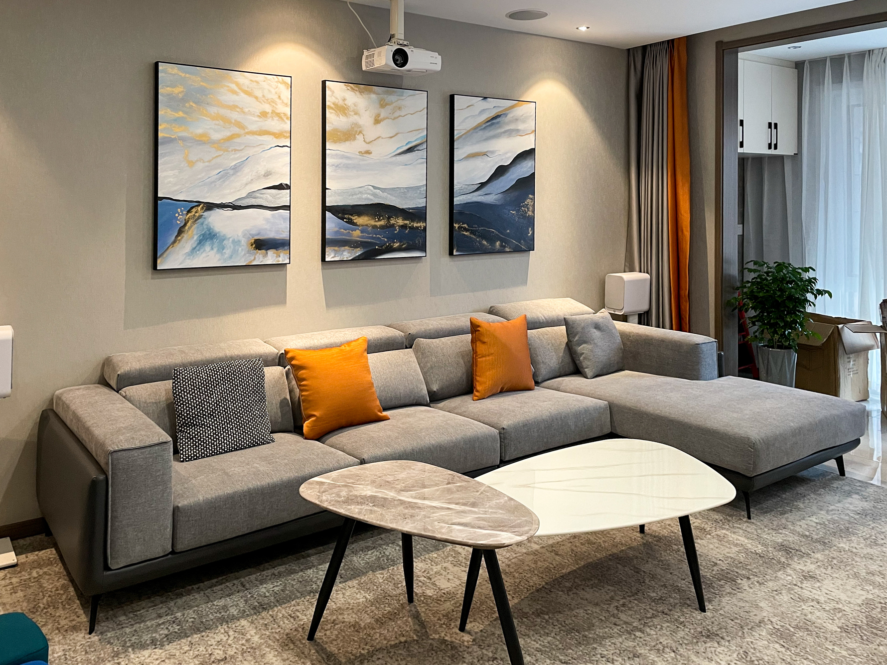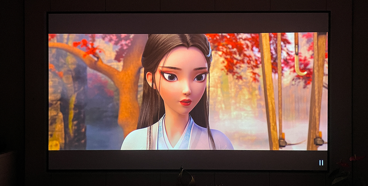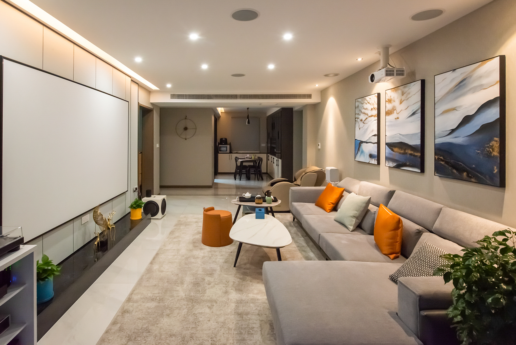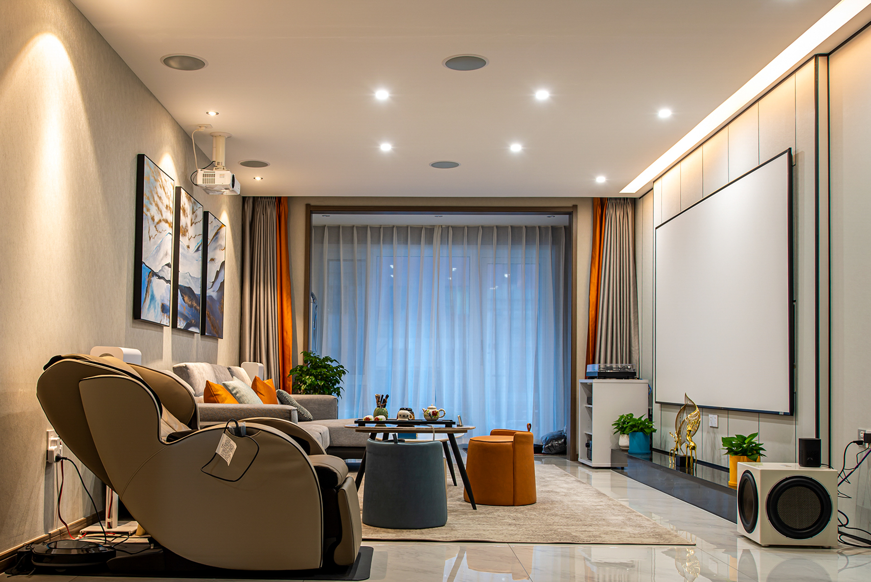 “小爱同学,我要看电影!”,“好的,搞定!”,客厅、餐厅窗帘徐徐关闭,投影机、氛围灯打开。芝杜播放器背景画面投在120英寸的透声画框幕上,选择自己喜欢的电影,半躺在沙发上,聆听着5.1.4杜比全景声系统带来的酣畅,这就是我客厅家庭影院……