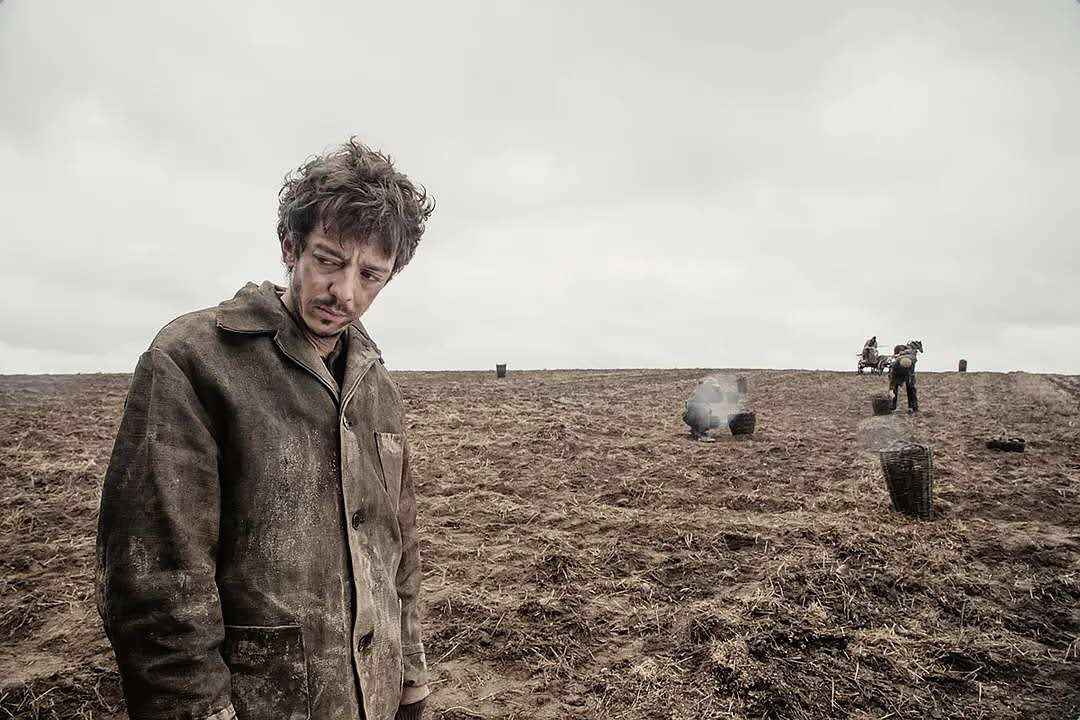接着,一个瘦小的男人出现在屏幕上,他神情哀伤,沿着铁轨向前走着。