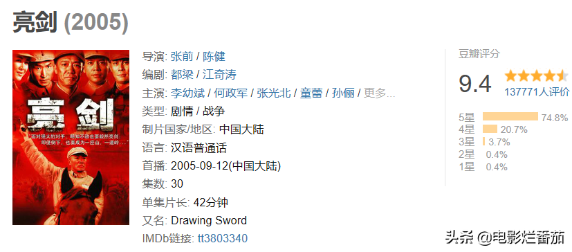 不仅数据漂亮,《亮剑》的后劲也很大,据网友统计,该剧播出5年后的重播次数就已经达到了3000次,15年后的今天,该剧的豆瓣评分仍高达9.4,可以说是无法逾越的经典之作。