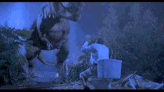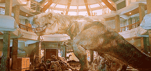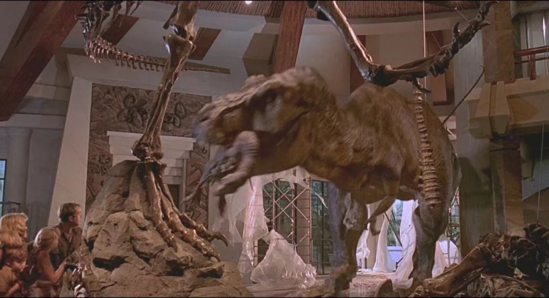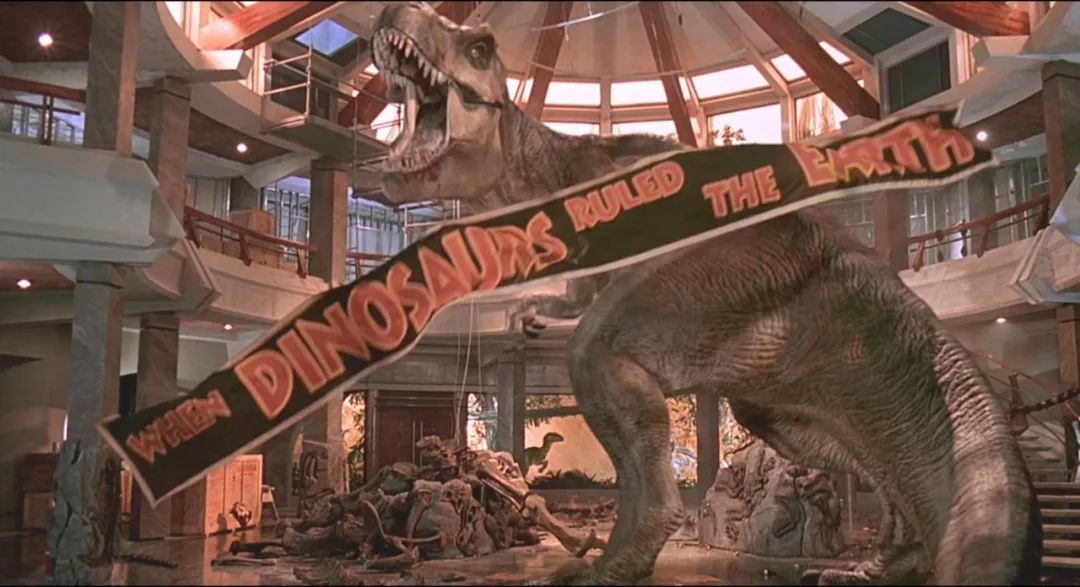 兰特他们趁机逃出了大厅,而霸王龙把两头伶盗龙咬死,留下了电影中最经典的一个仰天长啸的画面。