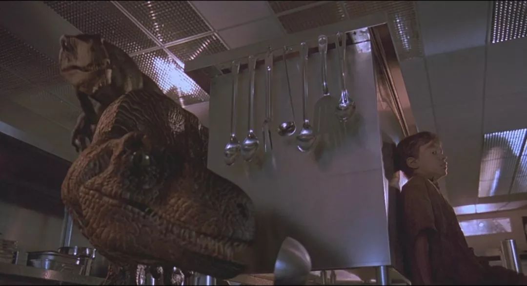 在开头造成安全事故的便是笼中的两头伶盗龙,但电影直到此处仍然保持着“神龙见首不见尾”,吊足了观众的胃口。