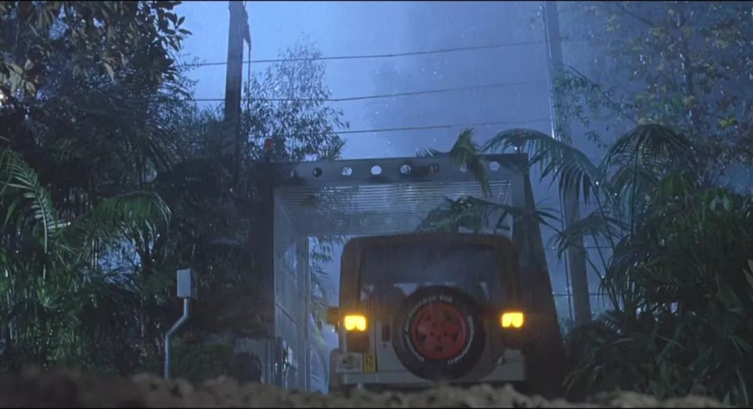这时候一个热带风暴正悄然来袭,游览行程被迫中止,格兰特他们又坐上游览车准备回去(当年电影在拍摄时,剧组的确遭遇了这个风暴,片中那些风暴的画面都是真实的)。