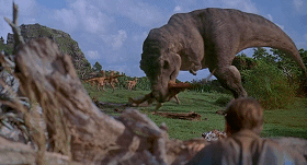 而工业光魔那些电脑绘图专家们认为这是个机会,他们私下制作了一头霸王龙在奔跑的画面(下图),把这段视频播给斯皮尔伯格看,斯皮尔伯格看了感到十分惊喜,他立刻改变了原计划,让工业光魔全权负责所有远景画面,一个用电脑特效制作巨大怪物的时代就这么诞生了。