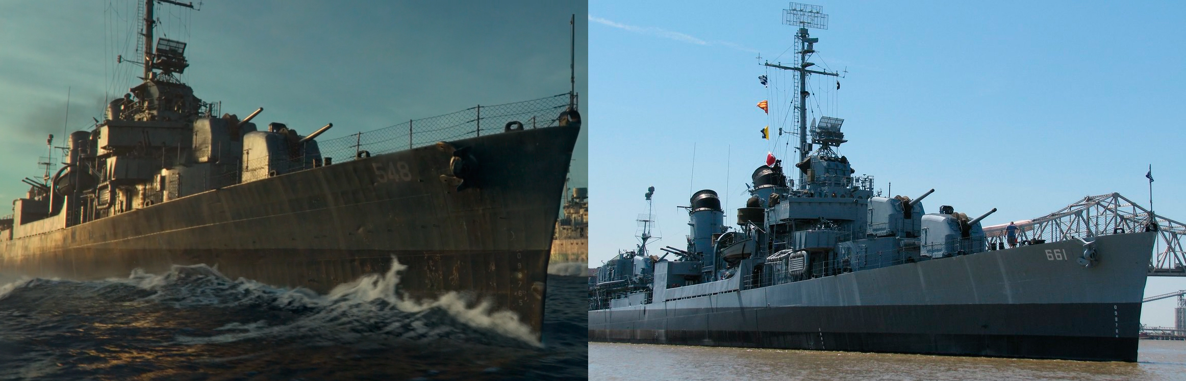 片中出现的4艘护航舰艇的外观,如同不少考证贴所言,正是取材自作为纪念舰保存至今的4艘著名的二战盟军驱护舰艇: