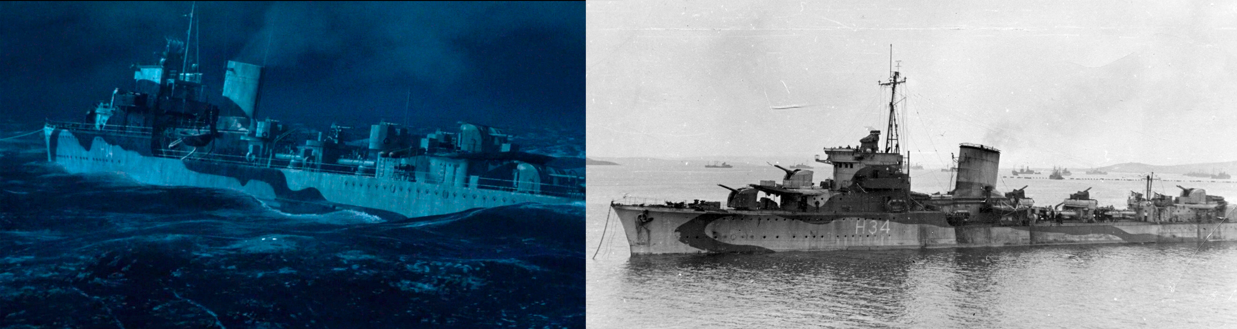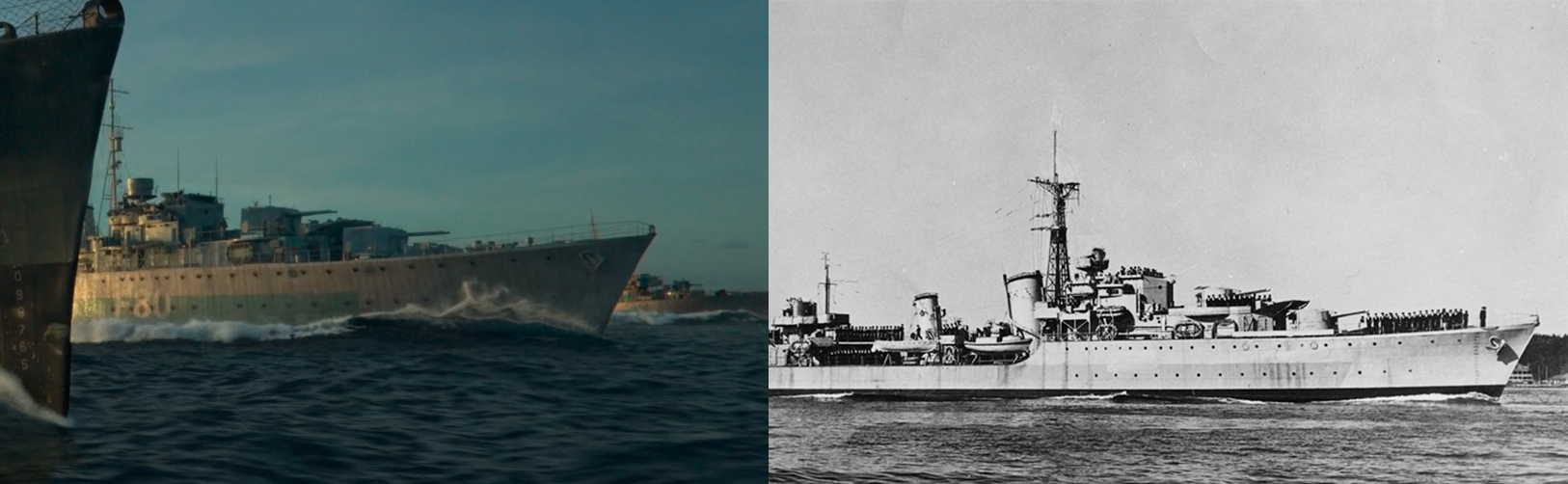利用现存纪念舰拍摄的优点是实拍场景和cg场景可完全吻合,从博物馆档案中则可便利获得涂装等资料(片中四舰的涂装方案都是相对应的纪念舰曾经用过的,eagle的舷号甚至直接涂了“闪电”号的h.34,另三艘则有更改),而且选择这样4艘现存舰还有着非凡的纪念意义,可以说是一个非常有想象力的解决方案了。但这样选舰的缺点就是和真实历史差距较大,弗莱彻级的年代和故事时间不吻合还不是最主要的,我觉得最可惜的一点就是该片进一步地巩固了一个长久存在的误区,就是笼统地把驱逐舰塑造为“u艇猎手”。