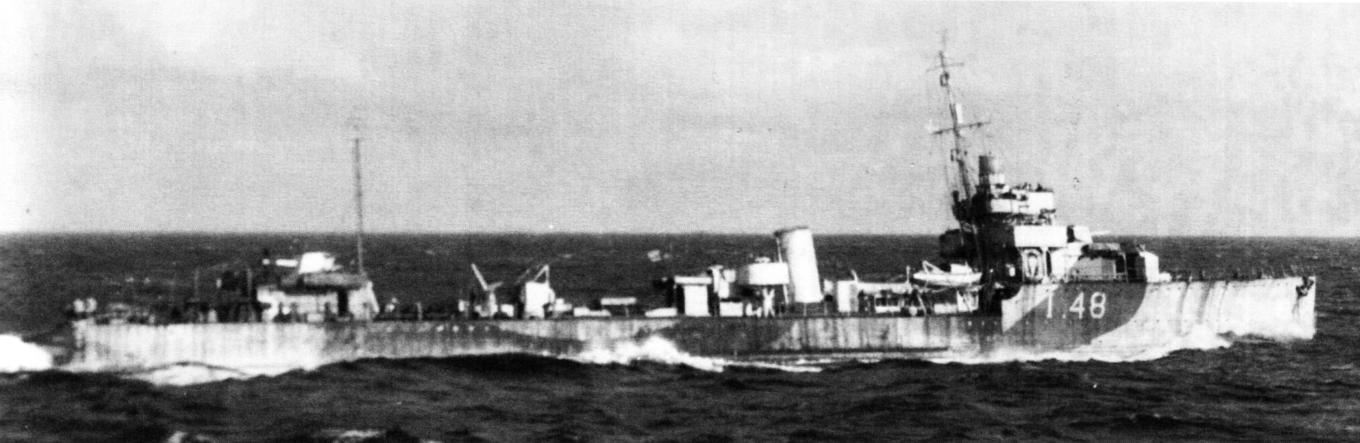 英国老式v级驱逐舰“维德特”号(hms vidette i.48),经过远程护航舰改装,拆除了前部锅炉和烟囱以及一组鱼雷发射管,以降低航速为代价换取额外储油空间。该舰曾参与击沉德国潜艇5艘,并且是扭转大西洋之战局势的著名的ons-5护航战役的重要见证者。