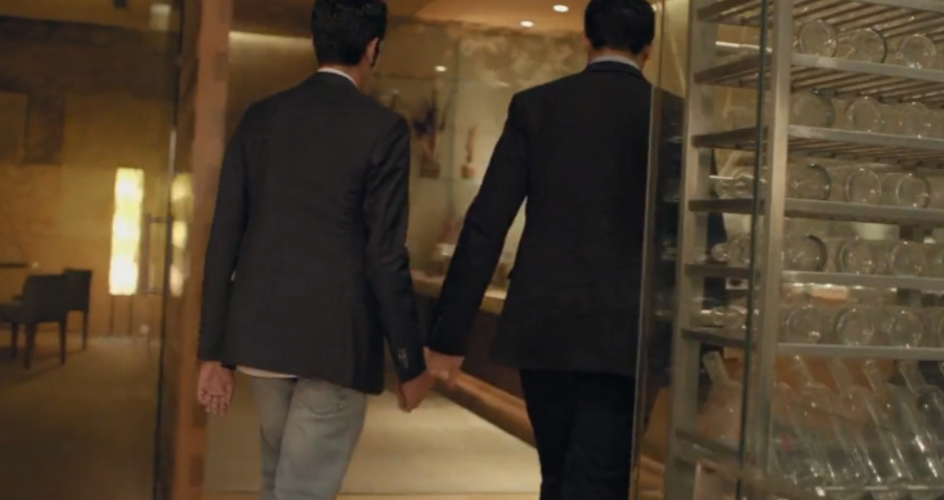 萨希顺势牵起了杰的手,走在酒店的小路上,路人怪异的眼神;当萨希再度牵起杰的手,却因为在高级餐厅里,杰放开了萨希的手。