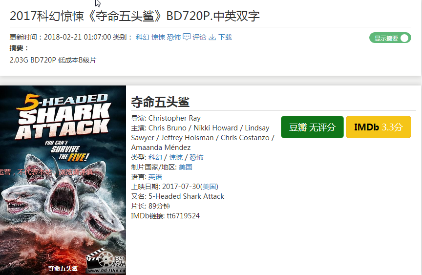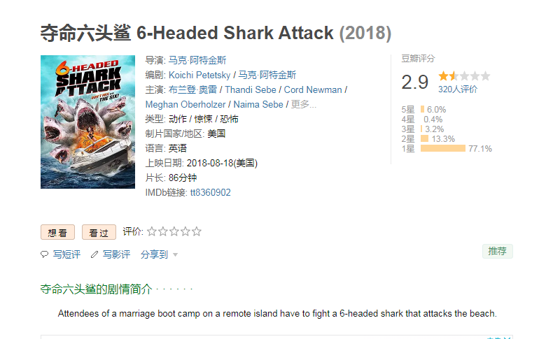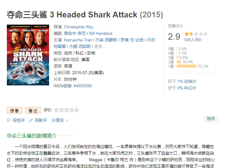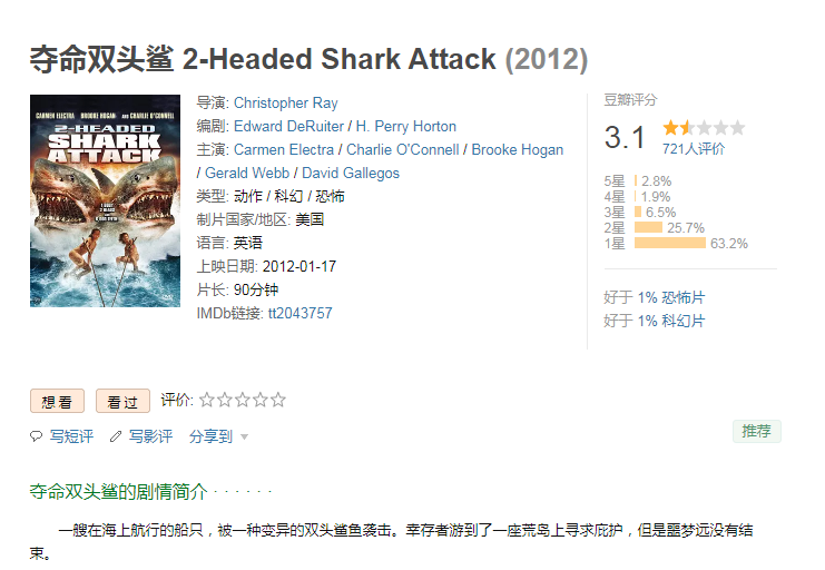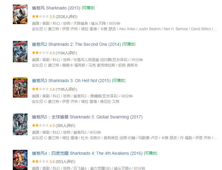 第二部推荐的这个多头鲨鱼系列,部部评分都在3分以下,但是已经拍了4部了。