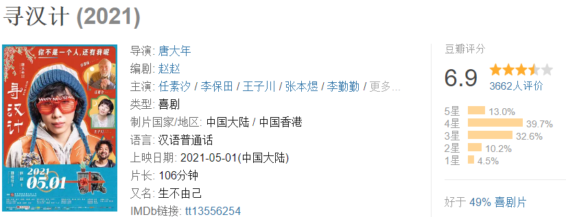 这部电影豆瓣评分只有6.9分,并不高,但在今年竞争惨烈的五一档,这个口碑还是排在了第二,仅次于张艺谋7.7分的《悬崖之上》。