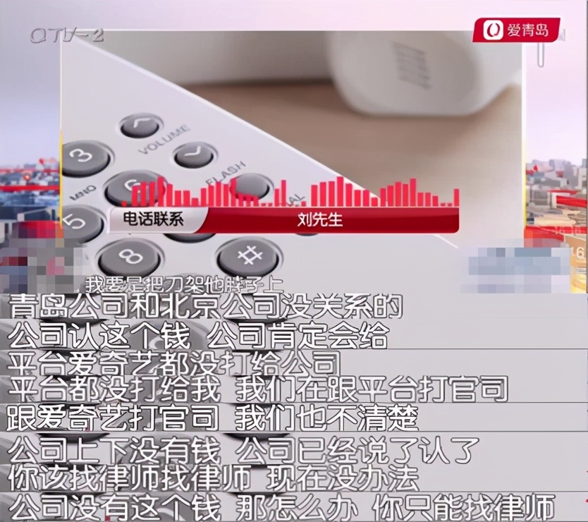 刘先生:平台都没打给我,我们在跟平台打官司呢,跟爱奇艺打官司呢,我们也不清楚啊。公司上下没有钱啊,公司已经说了认了,已经通过这种协商的方式了,你该找律师找律师,现在没办法,那他现在非得要这个钱,公司没有这个钱,那怎么办,你只能找律师呗。