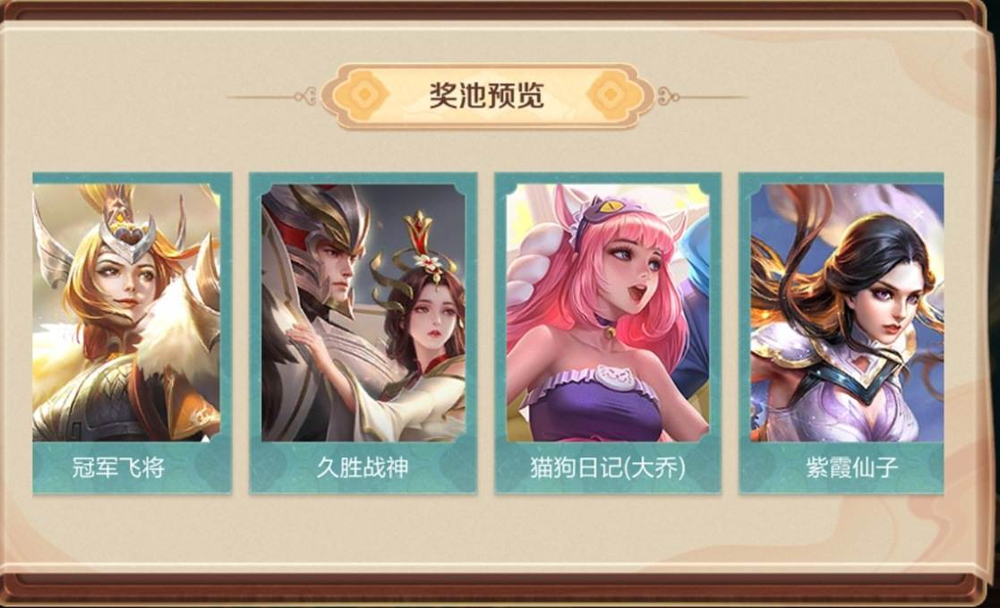 高级奖池的奖励则要好上很多,其中最好的奖励就是干将莫邪的久胜战神和花木兰的冠军飞将,这两款皮肤都是传说级别的,然后次一点的奖励就是紫霞仙子和大乔猫狗日记这两款史诗皮肤了。其他的则和普通奖池一样,都是皮肤碎片和荣耀积分等等,不过数量要比初级奖池的多一些。高级奖池是50点券抽一次,250点券抽5次。