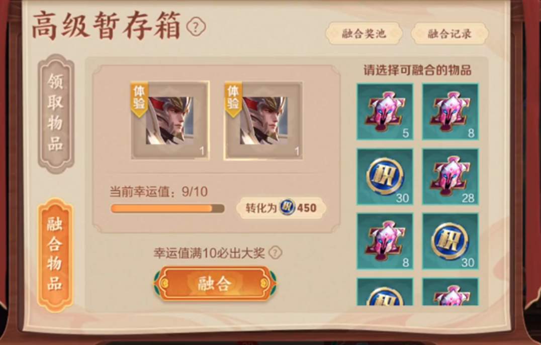 融合有幸运值设定,每次融合如果没出大奖就得到一个幸运值,幸运值到达10之后百分百获得大奖。