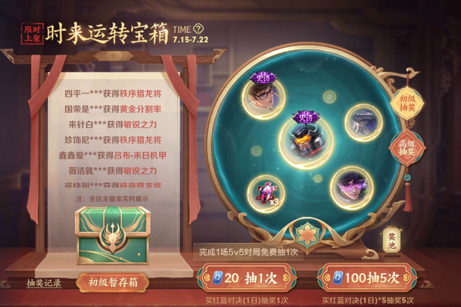 首先这个活动分为高级和初级两种,初级奖池是20点券抽一次,100点券抽五次,初级奖池里面最好的皮肤就是诸葛亮的黄金分割率和吕布的末日机甲。