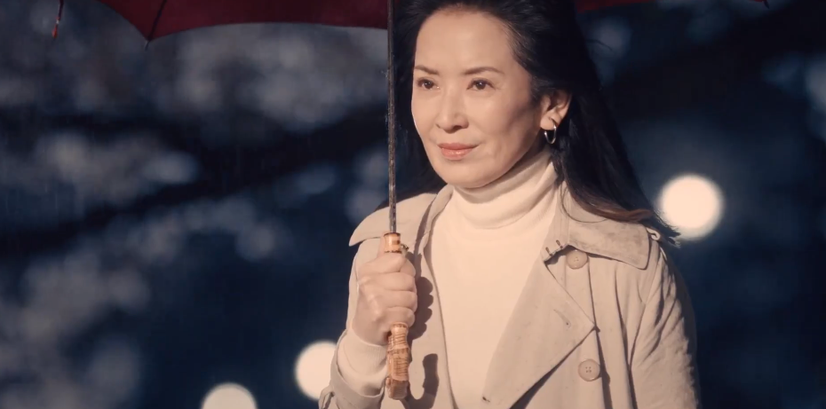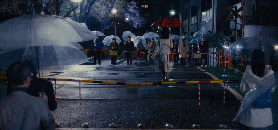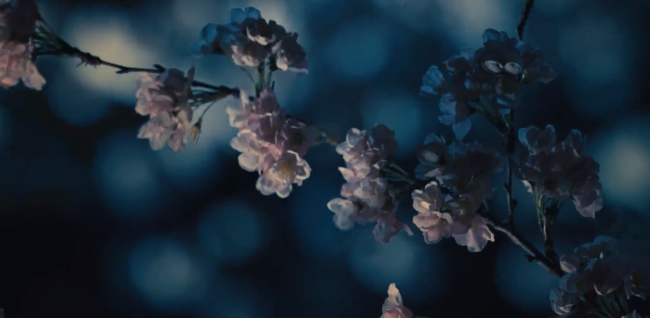 夜晚被风吹动的樱花,有花瓣缓缓落下,远处的灯光忽明忽暗,形成一团光晕,观众无法判断这一幕是美好还是恐怖。