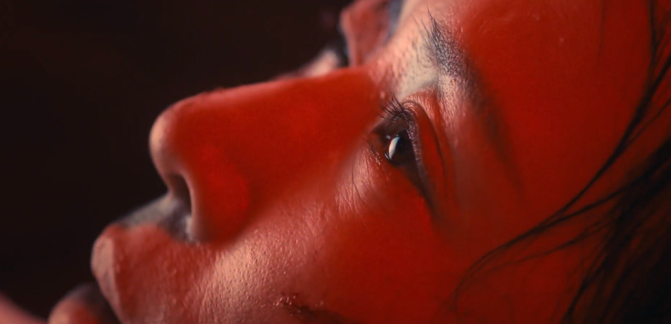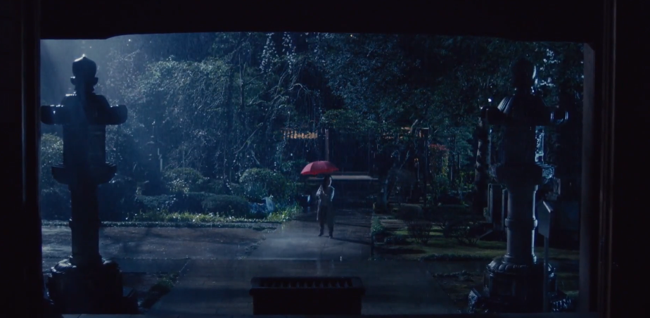 漆黑的夜晚,古刹中,这个打着红色雨伞的女人在雨中伫立,她站立的地方恰好就是景框的中心点,一切都是暗色调,只有那把鲜红的雨伞,十分扎眼。