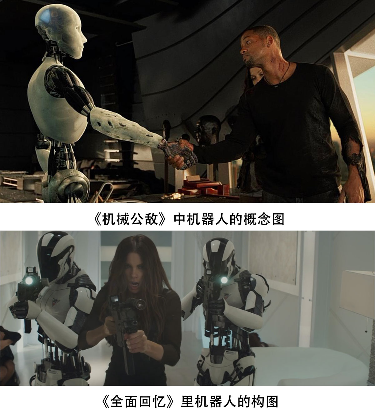 《机械公敌》改编自阿西莫夫的短片小说集《我,机器人》,其实原著囊括了五大种类的机器人:哑声的机器人、环舞机器人、怀疑论机器人、会说谎的机器人、仿生人机器人等,2004年的电影版展示了两种机器人的外观概念,最简单的就是白色外观概念的机器人,而《全名回忆》未来世界的机器人直接沿用这一外观概念,同时所有机器人具备实时沟通能力和自主判断杀伐决策。
