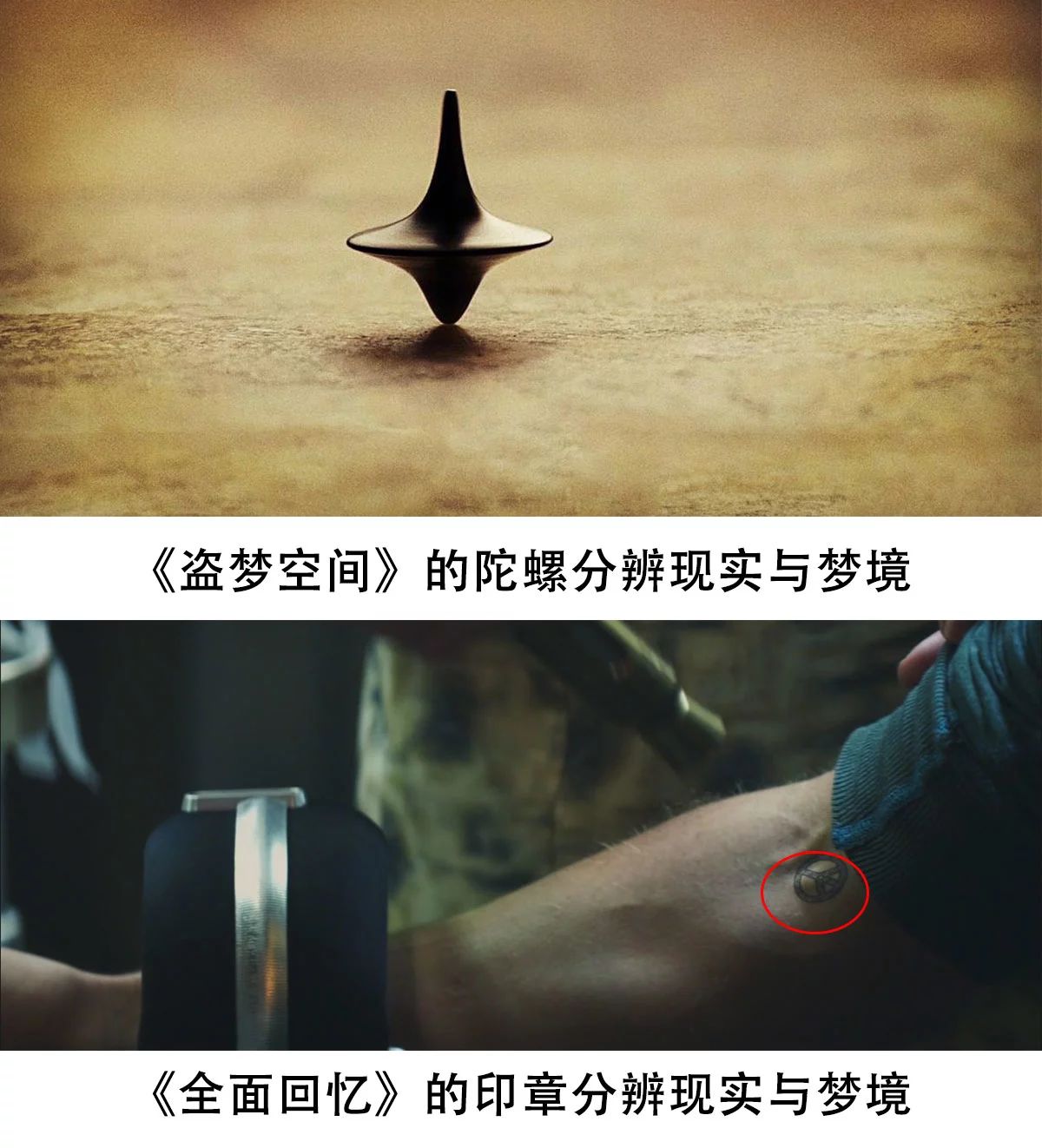 《全面回忆》里因为人的记忆很容易被篡改,处于未来世界的人都容易对现实产生怀疑,不光主角辨别不清幻想世界与现实世界,观众同时也难以区别梦境和现实,所以利高公司在给客户注入记忆时,盖印了一种半永久纹身,但是狡猾的导演在结局时,也故意剪断了盖印的特写镜头。