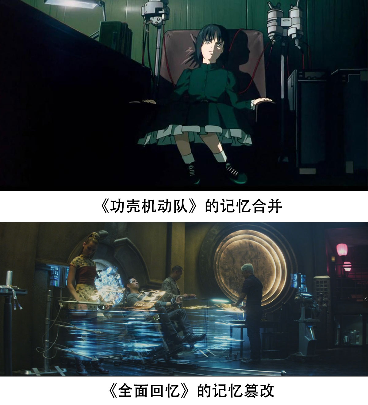 在95版《攻壳机动队》少佐和傀儡师记忆合并一起,产生一种新式生命体,是对人的主体性的深层批判,作为人的主体肉身不再具有独特性了,真实的主体其实是人的意志,外在客体形式是通过插管完成记忆合并。而《全面回忆》利高公司直接保存主角的原有记忆,在化学物质的作用下,主角借虚假记忆沉浸于拯救世界的身份无法自拔。