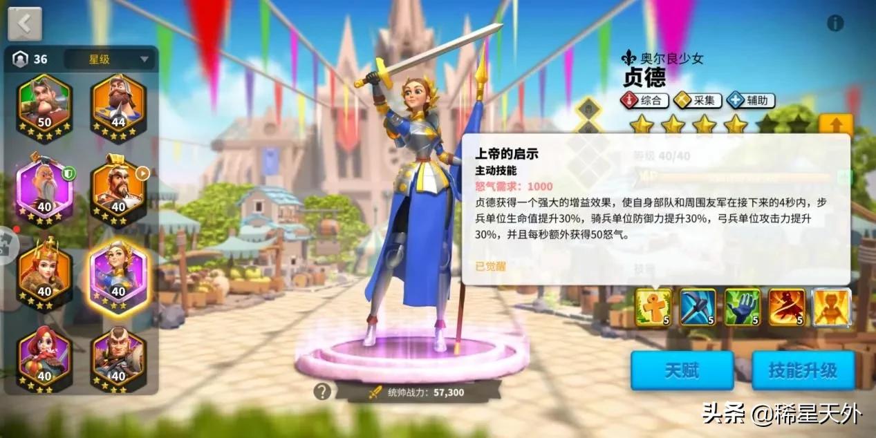“上帝的启示”技能应该是反映了贞德遇见天使,领受上帝的使命的故事。圣行神授后大幅提升部队能力再正常不过了,只是觉醒前还能提升就有些扯淡了,要知道传说中贞德遇见天使才13岁。主要可能还是为了增加游戏可玩性。
