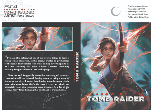 《古墓丽影:暗影》重绘版封面是与知名画师rossdraws合作完成的,他是一位插画家和概念艺术家,最近刚刚登上福布斯排行榜。rossdraws小时候喜欢编造角色和世界,16岁时开始更认真地追求艺术,一年后搬到洛杉矶攻读工业设计学位。19岁时,他作为一名角色设计师完成了他的第一部故事片《地球回声》,并在自己的油管频道rossdraws里发布了很多创作的艺术作品。