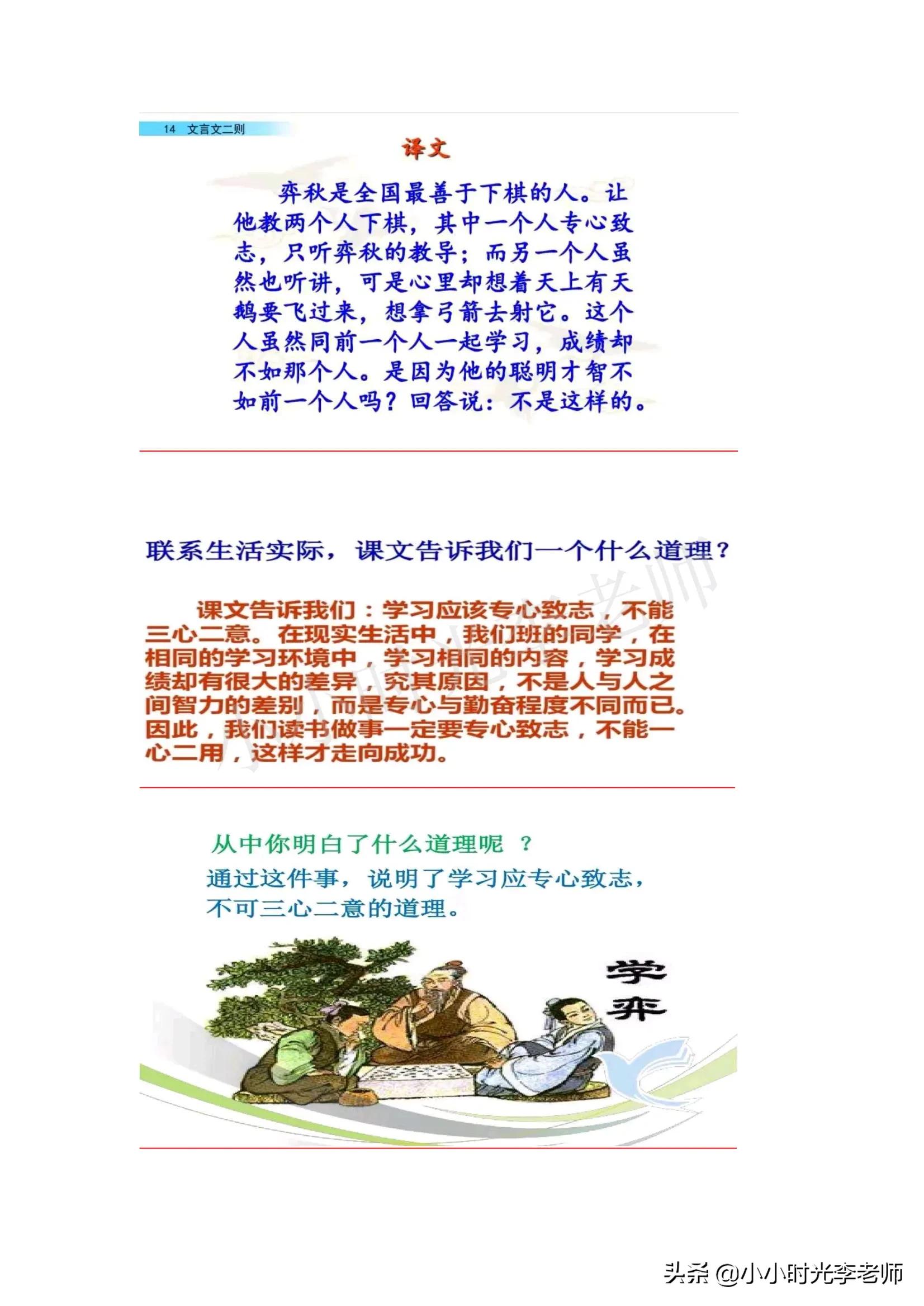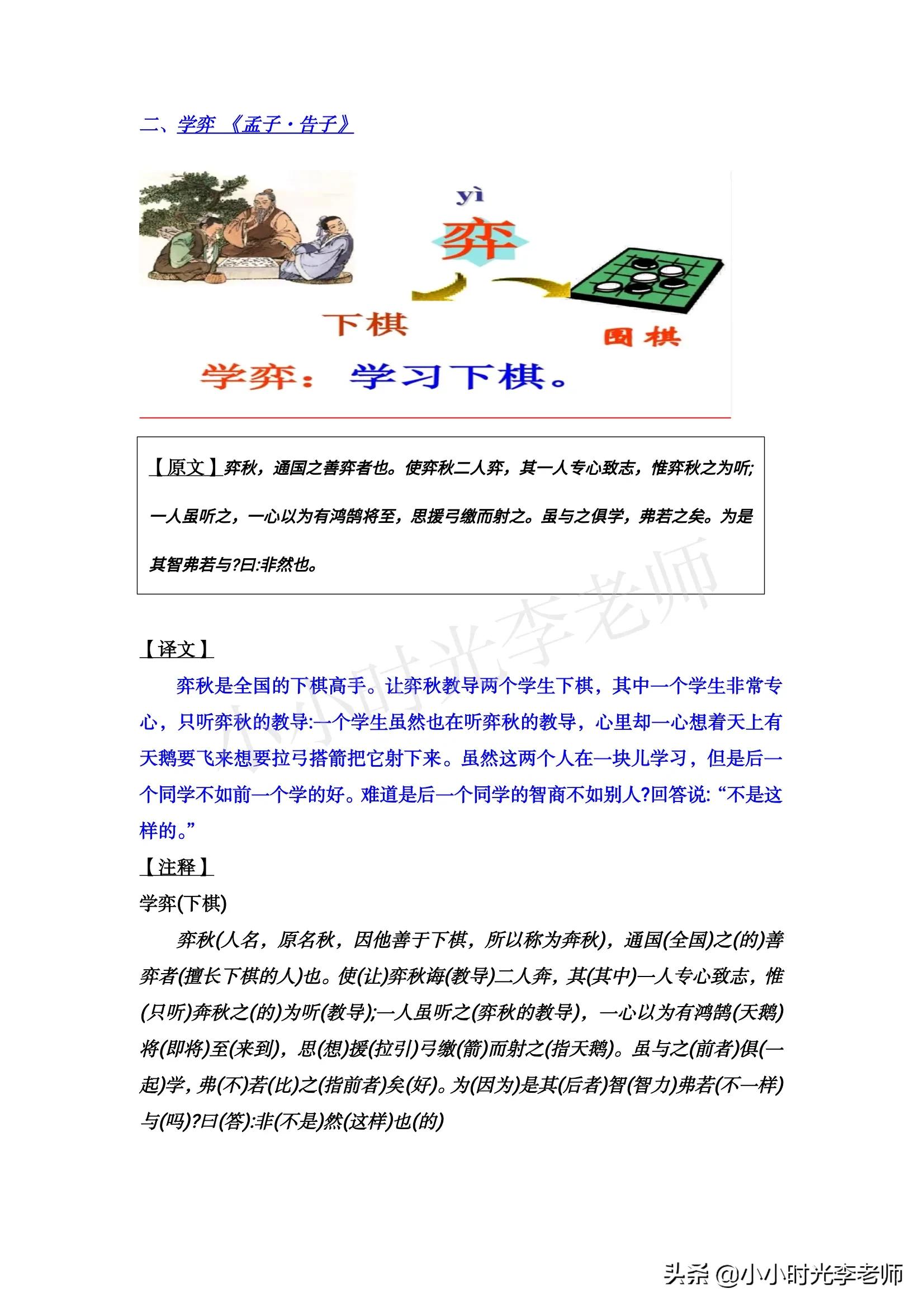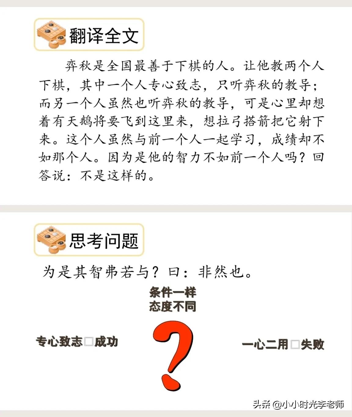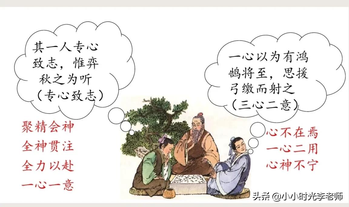 弈秋是全国的下棋高手。让弈秋教导两个学生下棋,其中一个学生非常专心,只听弈秋的教导:一个学生虽然也在听弈秋的教导,心里却一心想着天上有天鹅要飞来想要拉弓搭箭把它射下来。虽然这两个人在一块儿学习,但是后一个同学不如前一个学的好。难道是后一个同学的智商不如别人?回答说:“不是这样的。”