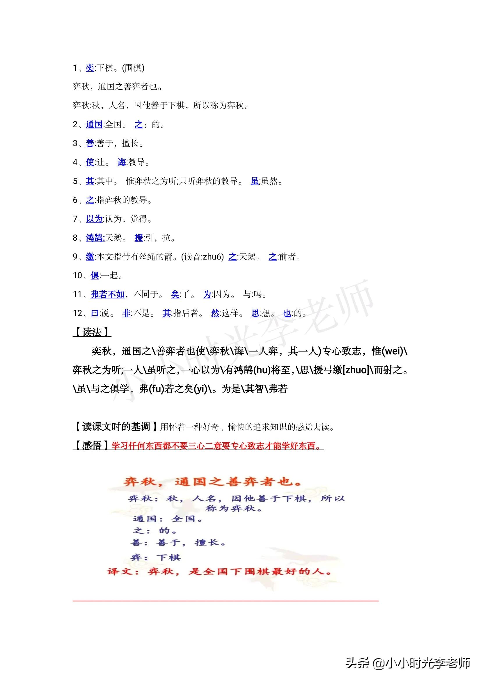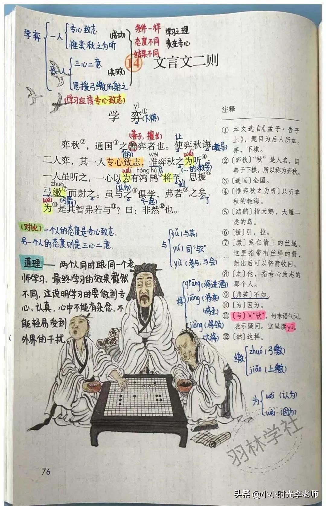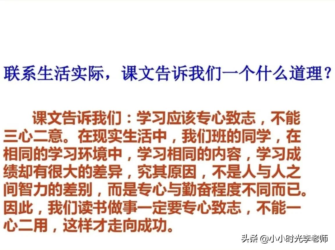 弈秋是全国的下棋高手。让弈秋教导两个学生下棋,其中一个学生非常专心,只听弈秋的教导:一个学生虽然也在听弈秋的教导,心里却一心想着天上有天鹅要飞来想要拉弓搭箭把它射下来。虽然这两个人在一块儿学习,但是后一个同学不如前一个学的好。难道是后一个同学的智商不如别人?回答说:“不是这样的。”
