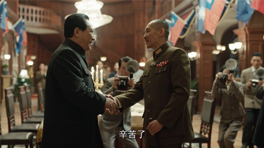 尽管是文戏,但依然能感受到剑拔弩张的紧张气氛:一个是带着最大的诚意来谈,为了和平愿意做出最大的让步;一个却是接着谈判来拖延时间,实则是全国运兵、想要抢占胜利果实。
