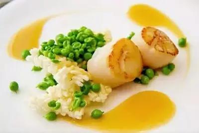 5、取一干净的盘子,放上刚刚煎好的元贝、鱿鱼花,配上焯好的豌豆粒,在其周围用勺子打上法式黄芥末酱,制作完成。