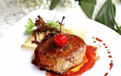 3、待鹅肝完全熟时,放在盘中,浇上法式红酒酱,用车厘子和小叶生菜、苦苣点缀,完成。