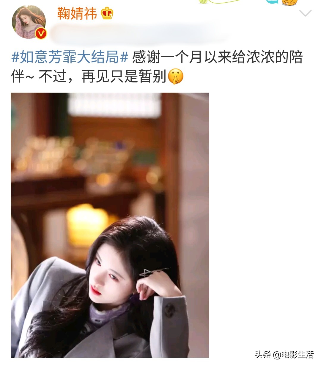 如今电视剧迎来最后的结局,鞠婧祎也在社交平台上发文表达自己的不舍,她表示“感谢一个月以来给浓浓的陪伴,不过再见只是暂别”,并搭配了自己一张慵懒侧卧的美照。据悉,这张照片中的造型是鞠婧祎即将和大家见面的另一个角色,乔以容。