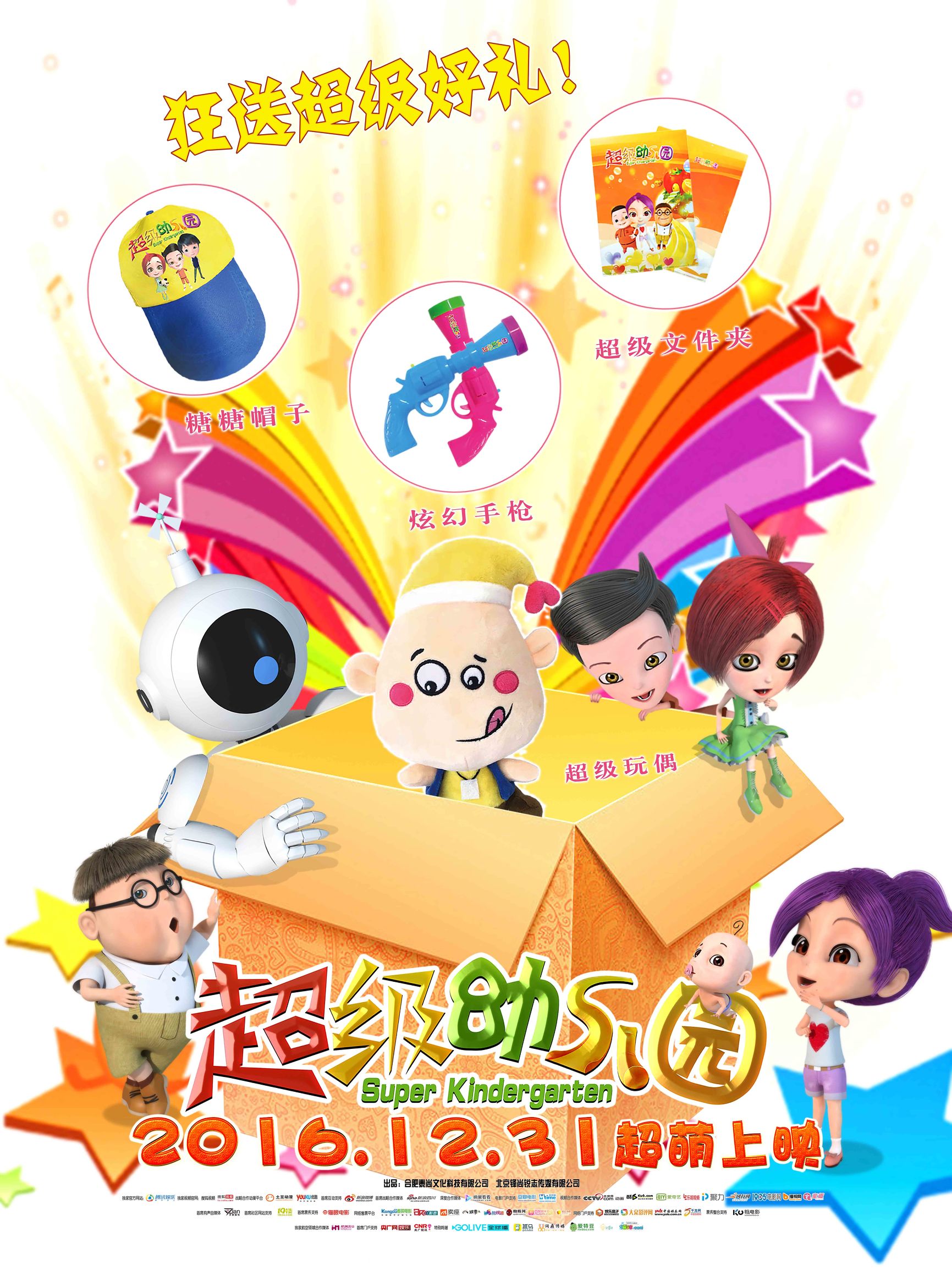 《超级幼儿园》礼品版海报此次发布的礼品版海报共三张,精美的礼物都有展现哦,瞧:毛茸茸的超级玩偶、卡通可爱的糖糖帽子、色彩鲜明的超级文件夹以及炫酷无比的炫幻手枪,怎么样,心动了吗?心动不如行动哦!买票就送!