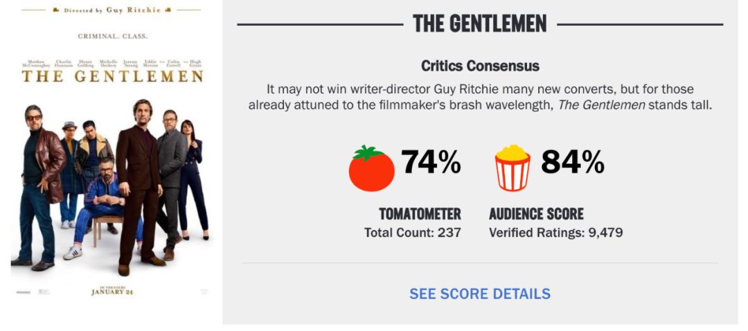 不过影片的各种梗满天飞,还有被各种意外弄到绅士面子全无的米奇和雷,以及灌满各种讽刺和黑色幽默的桥段,观众看得爽最重要,如果你觉得够爽,够刺激,够爆笑!那么《绅士们》的目的就达到了!
